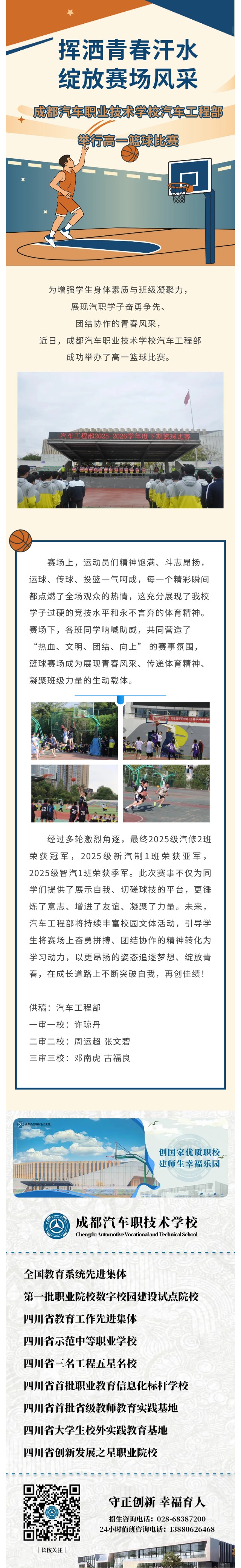 为营造奋进的校园文化氛围,发扬同学们的团结协作精神,促进学生全面发展。2021年4月27日—5月18日,成都汽车职业技术学校汽车专业部举行了2021年学生篮球比赛。 4月27日下午,随着裁判的哨响,篮球比赛正...