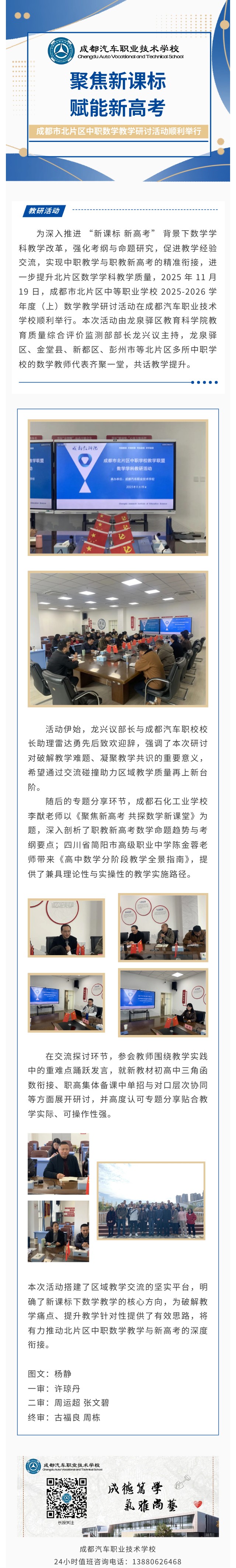 ——成都市中职学校国际理解课程教研活动为进一步推动成都市中职学校国际理解课程建设,提升教师专业素养与教学质量,2025年11月4日上午,成都市中职学校国际理解课程教研活动在成都汽车职业技术学校成功举办。成...