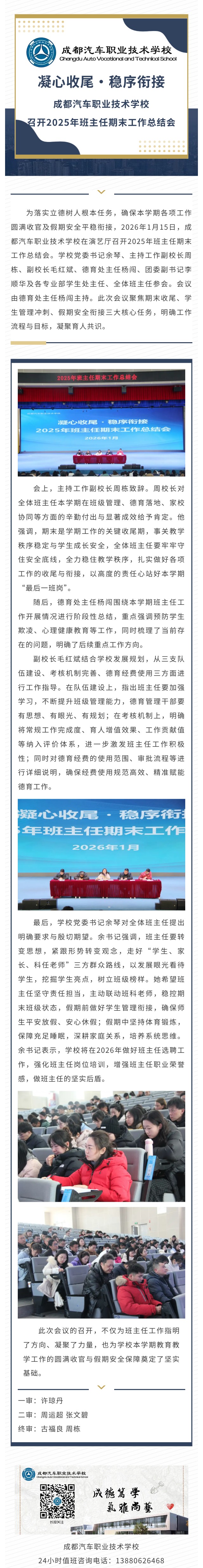 11月16、17两日,成都汽车职业技术学校班主任技能大比武在我校同安校区、向阳桥校区相继举行,五个专业部共推选出8位班主任参与决赛。比赛内容分为治班策略展示、主题班会课展示、班级活动方案撰写、学生心理个案...