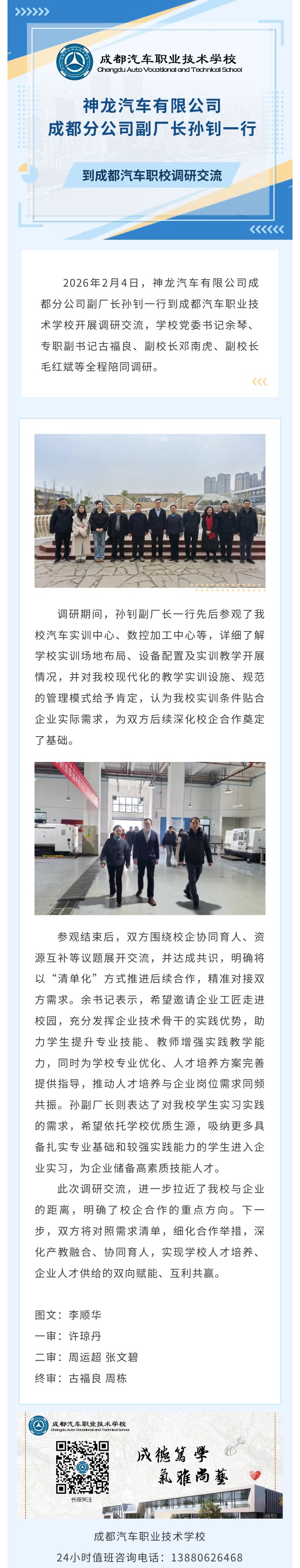 神龙汽车有限公司成都分公司副厂长孙钊一行到成都汽车职校调研交流